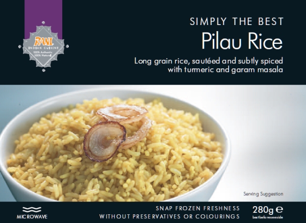 An aromatic dish, although made to accompany the Rani curries, is a tasty "savory " rice that can even be enjoyed on its own. It is sautéed in some whole spices and garam masala which releases a subtle fragrance and aroma in the product whilst being cooked and then again when re-heated.
